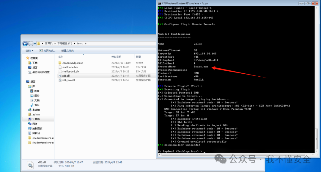 该工具不能直接获取shell,所以需要其他的shell加载器对shell进行加载,同时,该工具漏洞利用方式为dll注入,所以需要注意系统的架构以及注入的进程,经过测试,若是windows7系统x86架构,注入lsass.exe的话,主机会在1分钟后重启,导致shell不上线或者丢失,正向连接马子在方程式工具中,是可以开启目标机器监听端口,但是会被rundll32.exe检测到,防火墙会进行拦截,导致即使开放了监听端口而无法上线的情况;