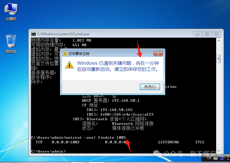 而后目标设备就要重启了,同时dll注入成功,端口1003被开放