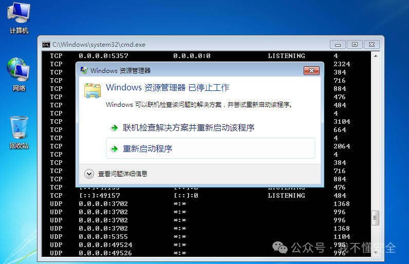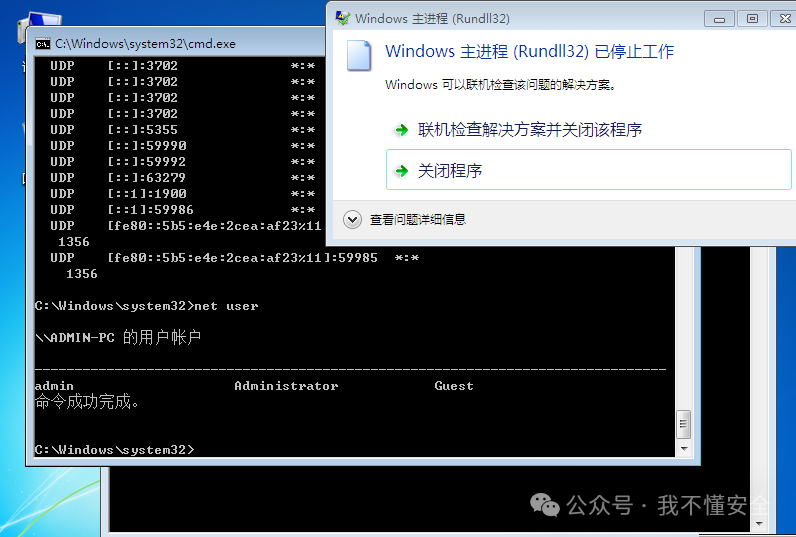 这里我们可以继续利用kali,然后假设我们不允许rundll32.exe,点击取消按钮,我们此时发现,端口依然会开放10001,但是kali死活连接不上去