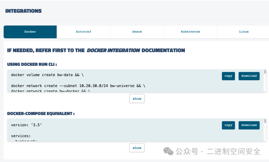 在集成配置中,支持Docker、Autoconf、Swarm、Kubernetes和Linux,每一项配置都已经准备好,直接下载使用即可, 如图: