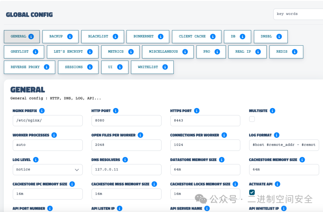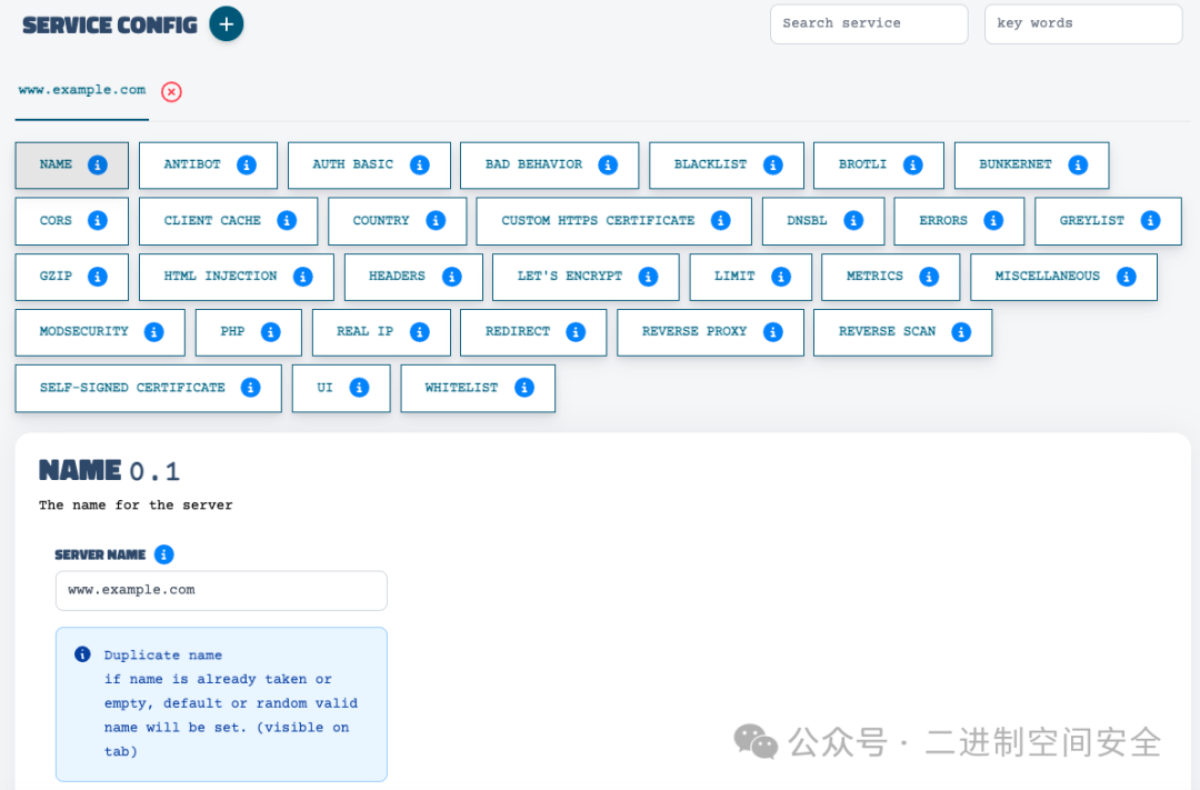 可以通过Web页面很方便的查看BunkerWeb支持的导入配置、全局配置、服务配置、文件管理、导出配置等参数。