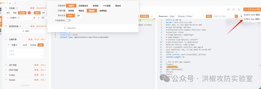 然后接下来我们添加匹配规则,点击规则=>匹配器=>添加,选择攻击者、响应体、输入关键字extensions