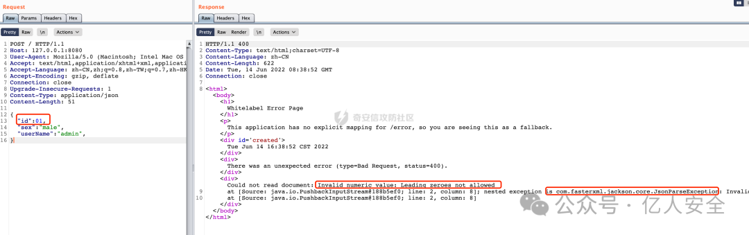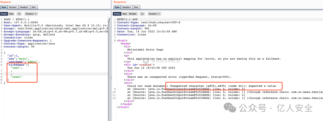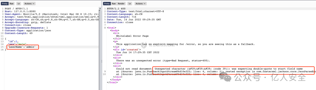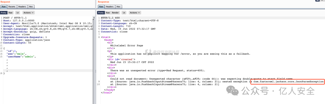 所以相比fastjson,jackson会比较严格,因为强制key与javabean属性对齐,只能少不能多key,所以在解析时会报错。服务器的响应包中多少会异常回显(或者是通用报错页面)。看一个具体的例子: