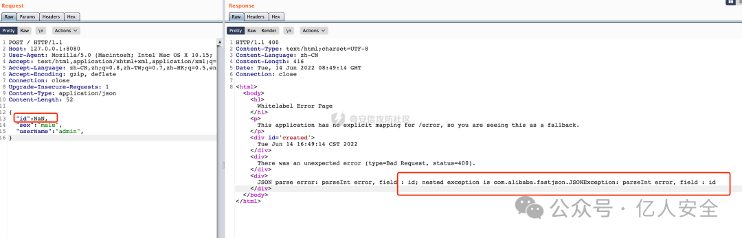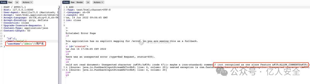 理想状态下如果站点有原始报错回显,可以用不闭合花括号的方式进行报错回显,报错中往往中会有Fastjson/Jackson的关键字: