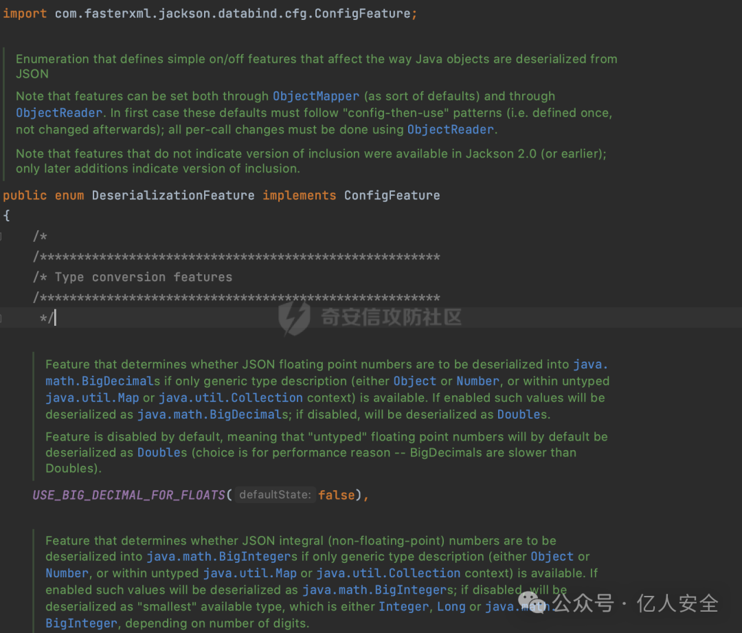 每个Feature都会有自己的默认值,例如下图中的USE_BIG_DECIMAL_FOR_FLOATS主要是将浮点数反序列化为BIG_DECIMAL,默认是False: