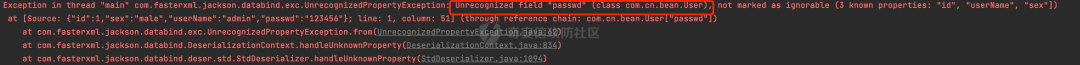 使用ObjectMapper对对应的Json字符串进行解析,因为没有passwd属性,在解析时会抛出异常: