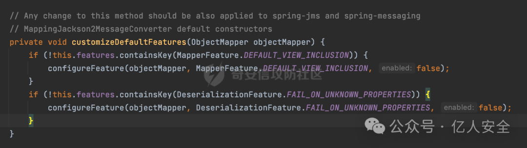 继续查看customizeDefaultFeatures方法的具体实现,可以看到这里将DeserializationFeature.FAIL_ON_UNKNOWN_PROPERTIES
