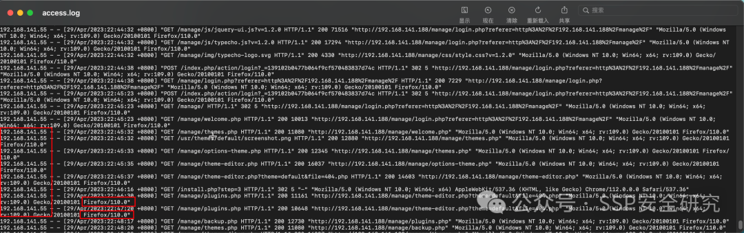 在日志文件中我们可以很清楚的看到攻击IP是192.168.141.55 浏览器的版本在User-Agent里面有