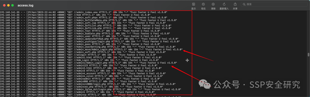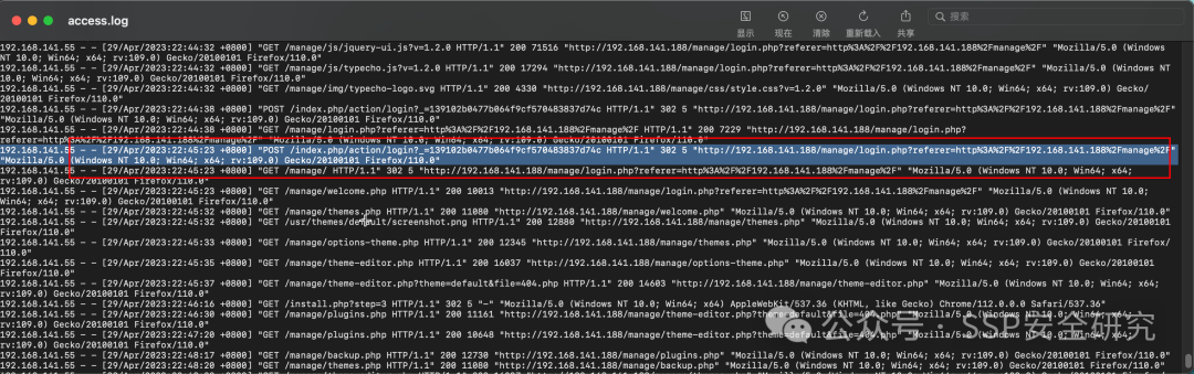 我们将Nginx的日志下载到本地进行分析,发现攻击者在进行fuzz 成功fuzz到登录接口,之后进行登录 在尝试一次登录后没有成功,在第二次登录时成功跳转到manage页面中,也就是如下的日志信息。