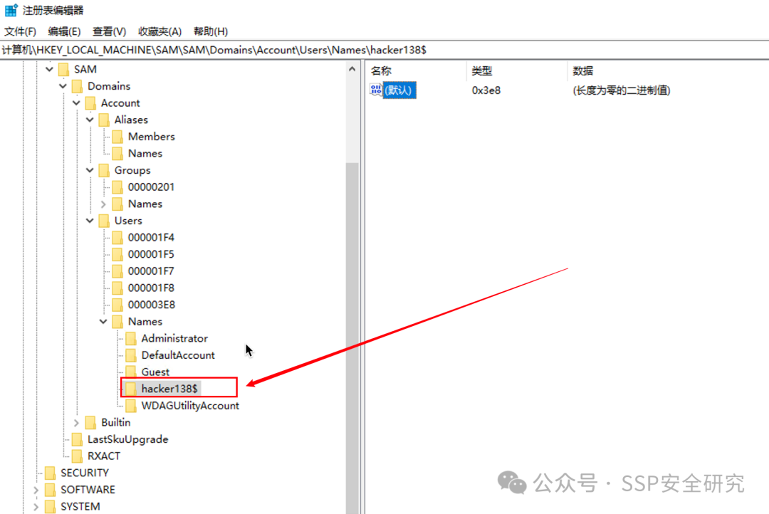 计算机\HKEY_LOCAL_MACHINE\SAM\SAM\Domains\Account\Users\Names\hacker138$