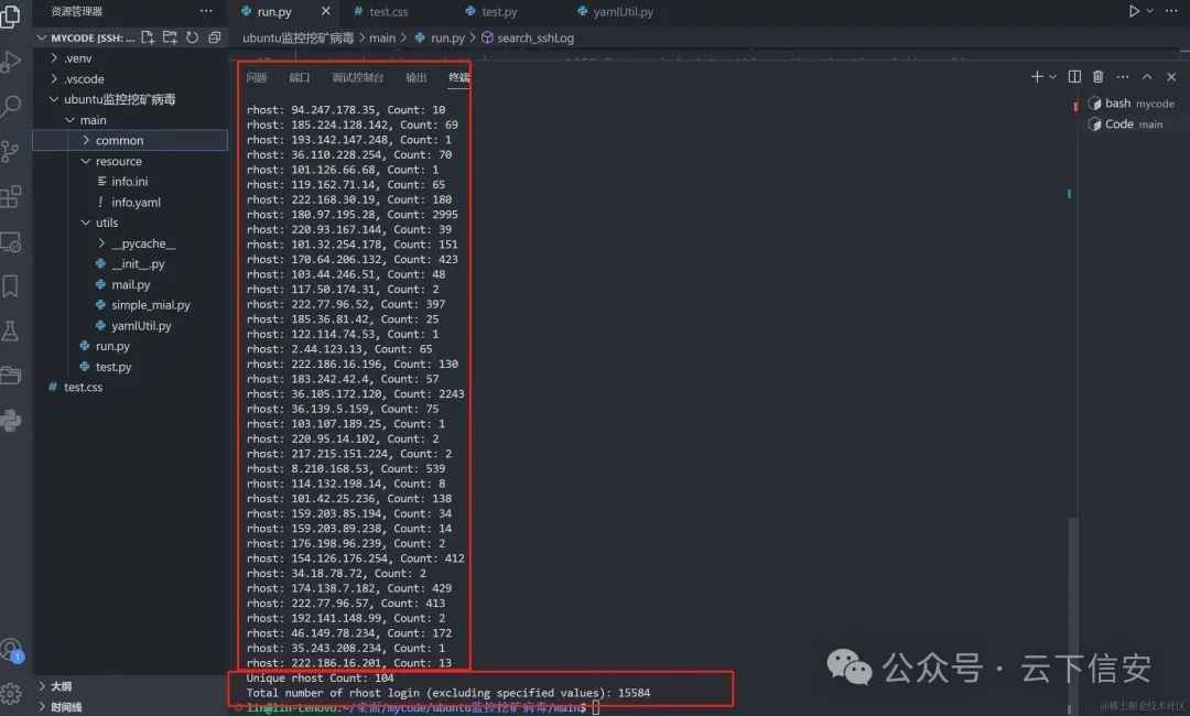 可以看到, 这是过滤掉了本机的IP地址以及内网 192.168 开头的IP地址后的统计结果,这七天时间,总共有100个左右的IP地址尝试通过ssh登录主机, 总共登录次数为15584次, 这些ip归属地分布世界各地, 猜测使用了ip池子进行伪装.