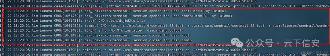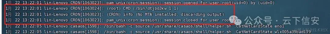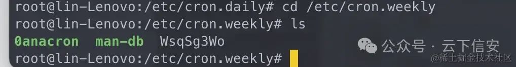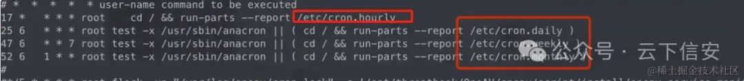 前面有个单词cron(定时任务的全称是crontab)那么初步猜测这东西可能跟定时任务有关,查看定时任务的配置文件,看到都是很常规的定时任务,那我们直接进入到系统的这四个定时任务的文件中去查看是否有可疑文件: