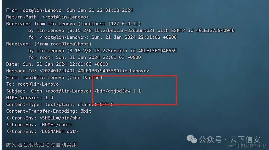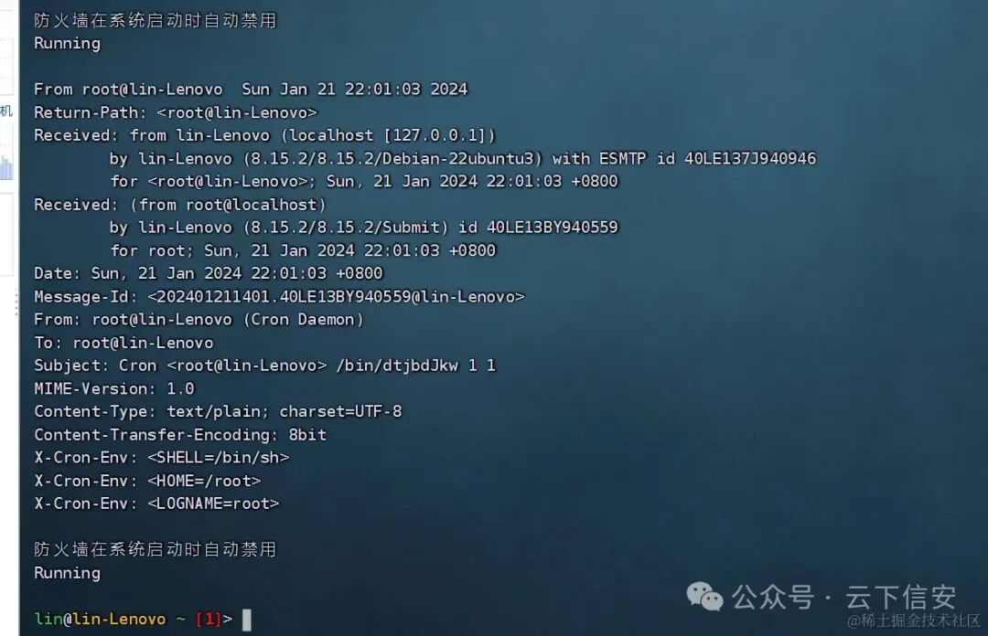 发现邮件通知了防火墙自动禁用的通知而且还有一个可疑的/bin/dtjbdjkw 1 1
