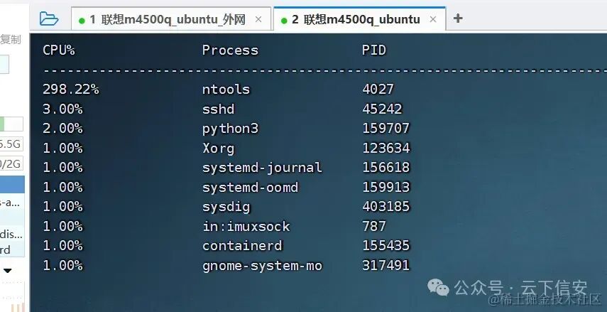 观察了三个定时任务目录后可以确认这个Wsqsg3Wo就是一个可疑文件, 我们直接rm -rf Wsqsg3Wo 将其删掉, 同时使用 kill -9 pid 结束掉ntools进程, 然后开启新的终端观察系统日志