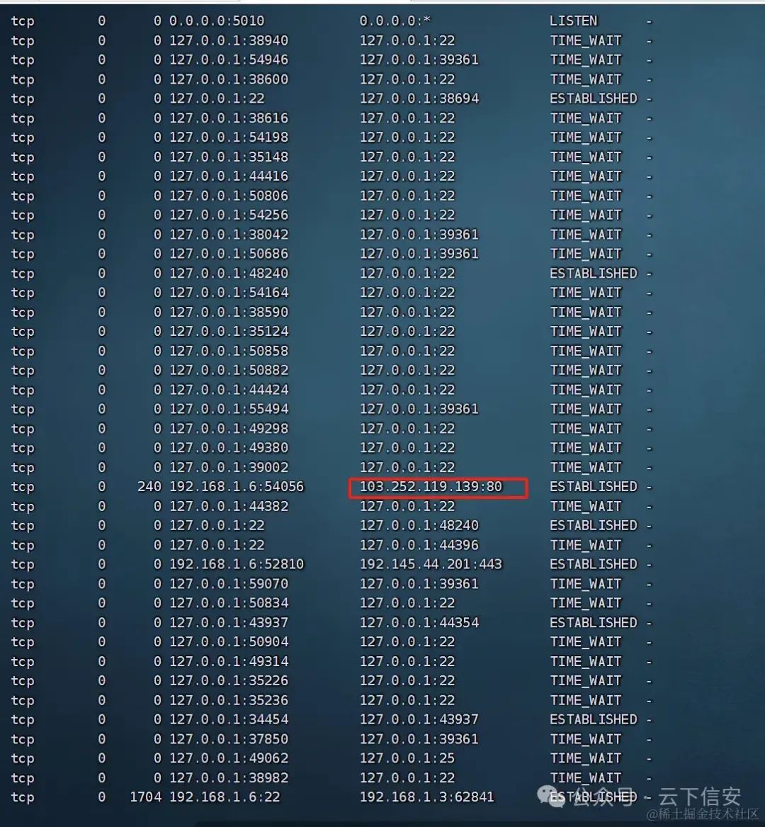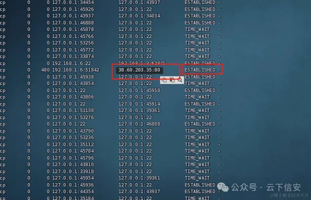 使用netstat -napt命令查看tcp进程服务,发现一个可疑的IP地址