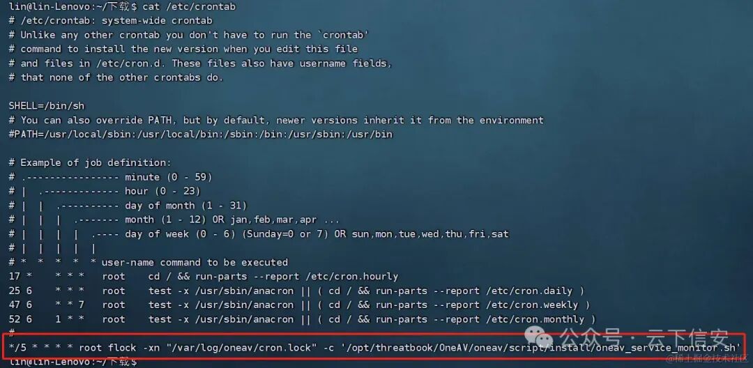 挖矿程序一般都设置了定时任务启动脚本程序,查看定时任务,crontab -l查看是找不到的。得看/etc/crontab文件,执行 cat /etc/crontab 。果然有任务在启动程序脚本 /var/log/oneav/cron.lock