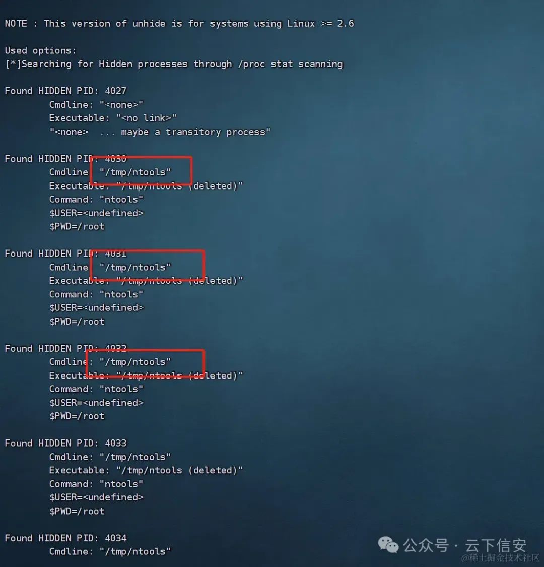 unhide proc # 自助搜索隐藏进程,linux系统中一切皆文件,proc目录下保存的就是所有正在运行程序的进程ID,即PID