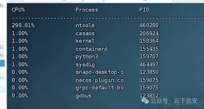 sysdig -c topprocs_cpu # 该命令可以输出cpu占用的排行,经测试可以显示出被隐藏的进程