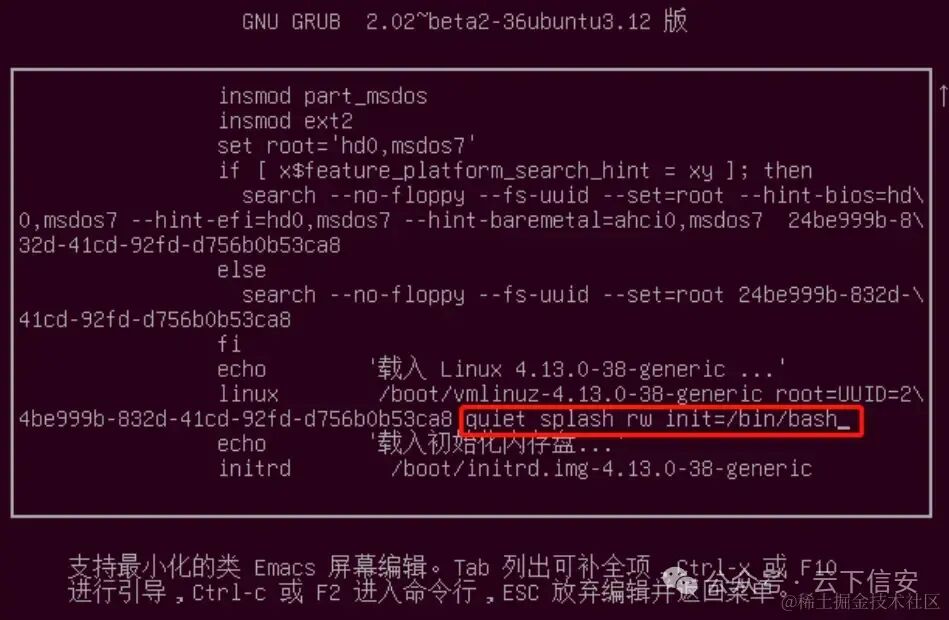 改为quiet splash rw init=/bin/bash,改完如下