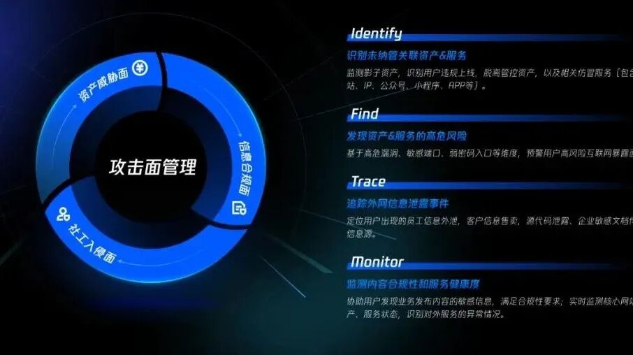 随着公司业务高速发展,面向互联网侧提供的业务服务范围也在高速扩张,导致整体资产暴露风险加剧,企业存在较多的安全盲点,容易成为攻击者的入侵口。攻击面管理则可以以情报为核心,构建主动的安全防御体系,以实现安全防护的关口前置。