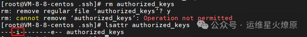 先把authorized_keys 文件的公钥删除。当我执行 rm 命令的时候,入侵者把我的 authorized_keys 文件加了 +i 锁,不允许删除,so sad: