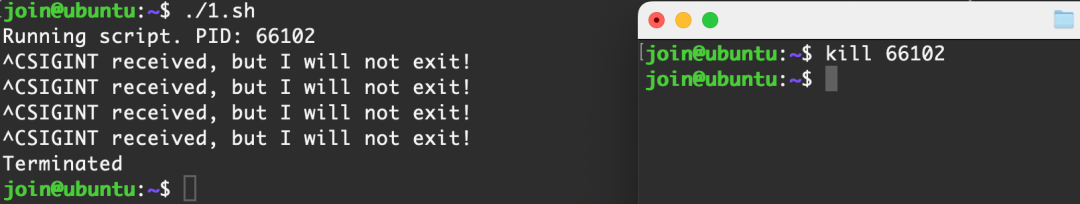 可以看到,脚本执行后,无法通过 Ctrl+C