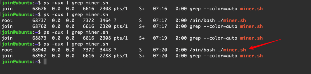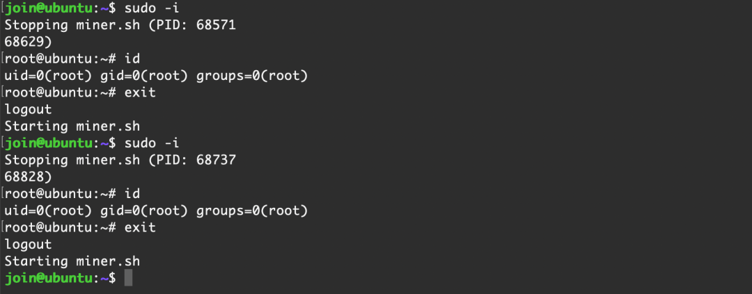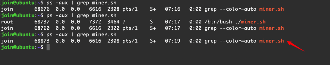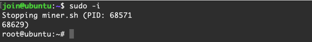 可以看到,root 退出登录后,挖矿病毒开始运行