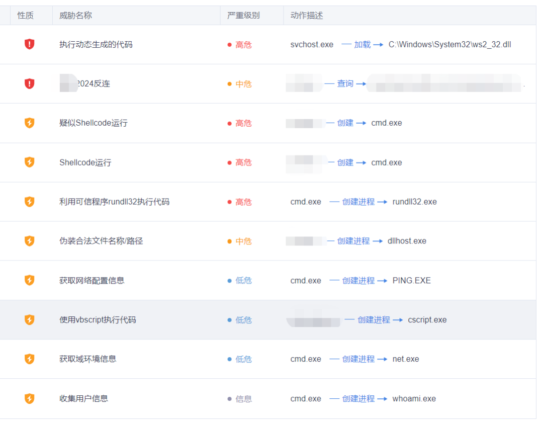 木马执行起来后,接收到控制端指令做的很多动作也都会被EDR有效捕获到,如下图所示,有的是为了加载dll执行提权,有的是为了收集机器的环境,有的是为了执行脚本进行内网穿透工具的安装等,都在EDR检测的范围内。