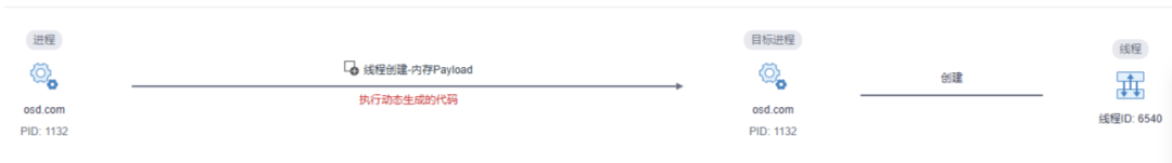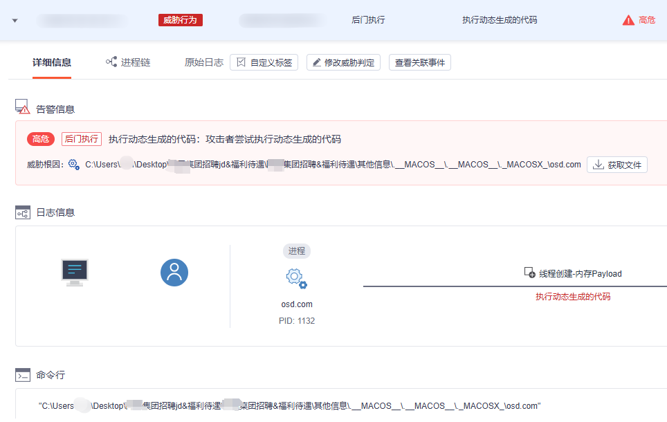 此外,OneSEC采集到了进程创建、代码生成、Payload加载、内存注入等多个行为,并最终定位到了威胁根因osd.com,进程链如下: