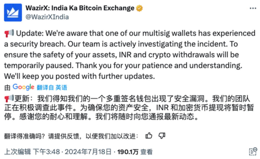 2024 年 7 月 18 日,印度加密货币交易所 WazirX 在 X 上发布网络攻击的初步调查结果,称其一个多重签名钱包出现了安全漏洞,导致损失超过 2.3 亿美元(约占客户资金的 45%)。