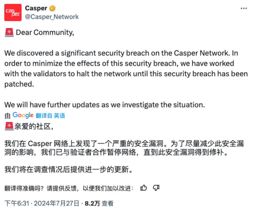 2024 年 7 月 26 日,Casper Network 遭攻击,随后 Casper Network 发推表示,为了尽量减少此安全漏洞的影响,已与验证者合作暂停网络,直到此安全漏洞得到修补。根据 7 月 31 日 Casper Network 发布的安全事件初步报告,此事件中有 13 个钱包受到影响,非法交易总额约为 670 万美元。Casper Network 发现攻击者利用了一个允许合约安装者绕过对 uref 的访问权限检查的漏洞,从而使他们能够授予合约对基于 uref 的资源的访问权。
