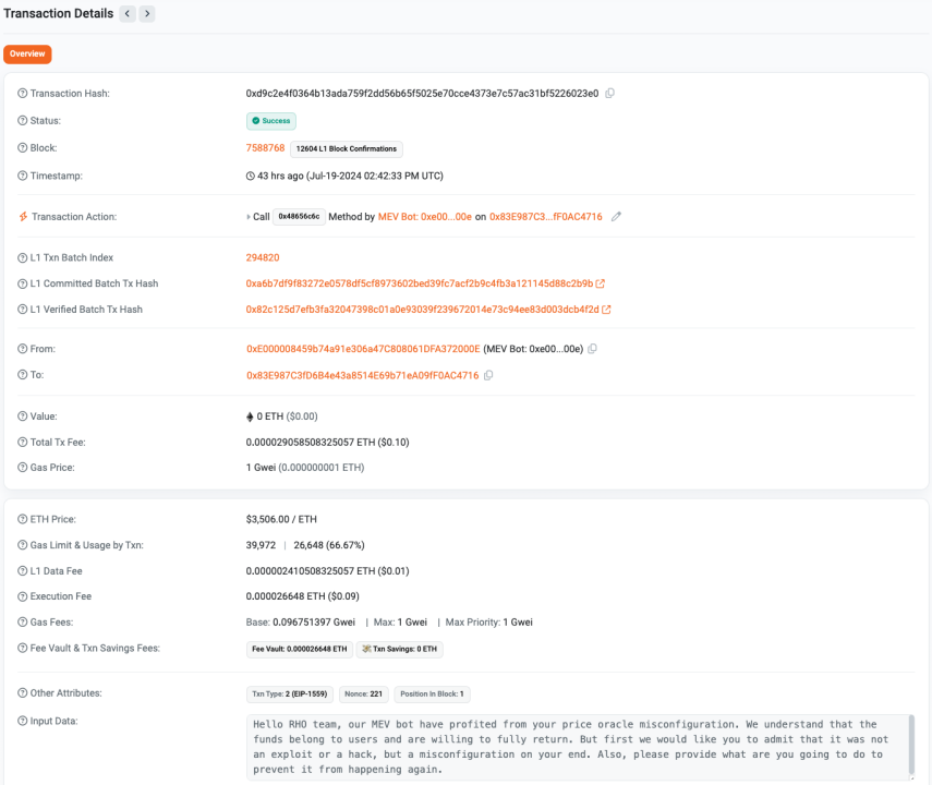 2024 年 7 月 19 日,借贷协议 Rho Markets 由于预言机配置错误被某 MEV Bot 套利 2203 ETH,约 760 万美元。同日,据链上侦探 ZachBXT 监测,该 MEV Bot 所有者于链上喊话 Rho Markets 团队,表示该事件是他们的 MEV 机器人通过 Rho Markets 价格预言机的配置错误获利,并愿意全数返还。