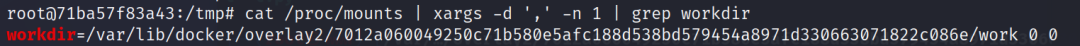 cat /proc/mounts | xargs -d ',' -n 1 | grep workdir