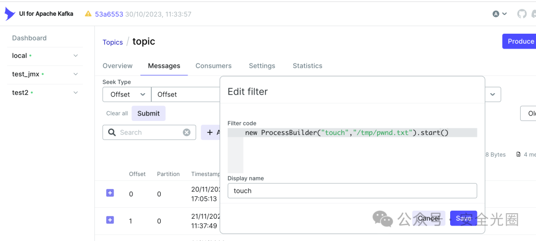 复现: Kafka UI用户页面,Cluster --> Topics --> Messages,然后创建一个新的过滤器。