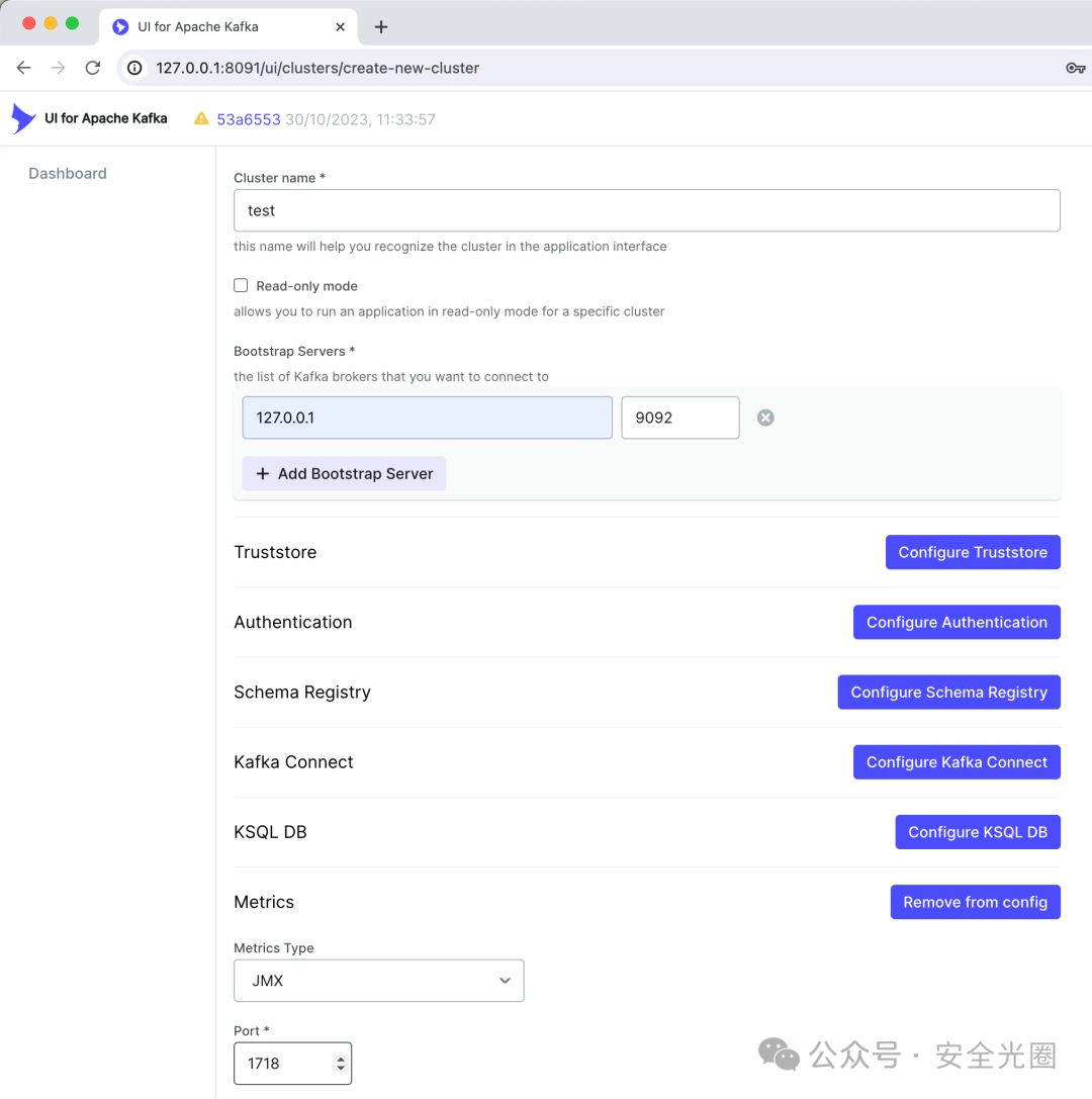 Kafka UI中,导航到控制台,设置一个新的集群(Dashboard->Configure New Cluster ),Bootstrap server设置IP,jmx地址为我们监听的1718端口。