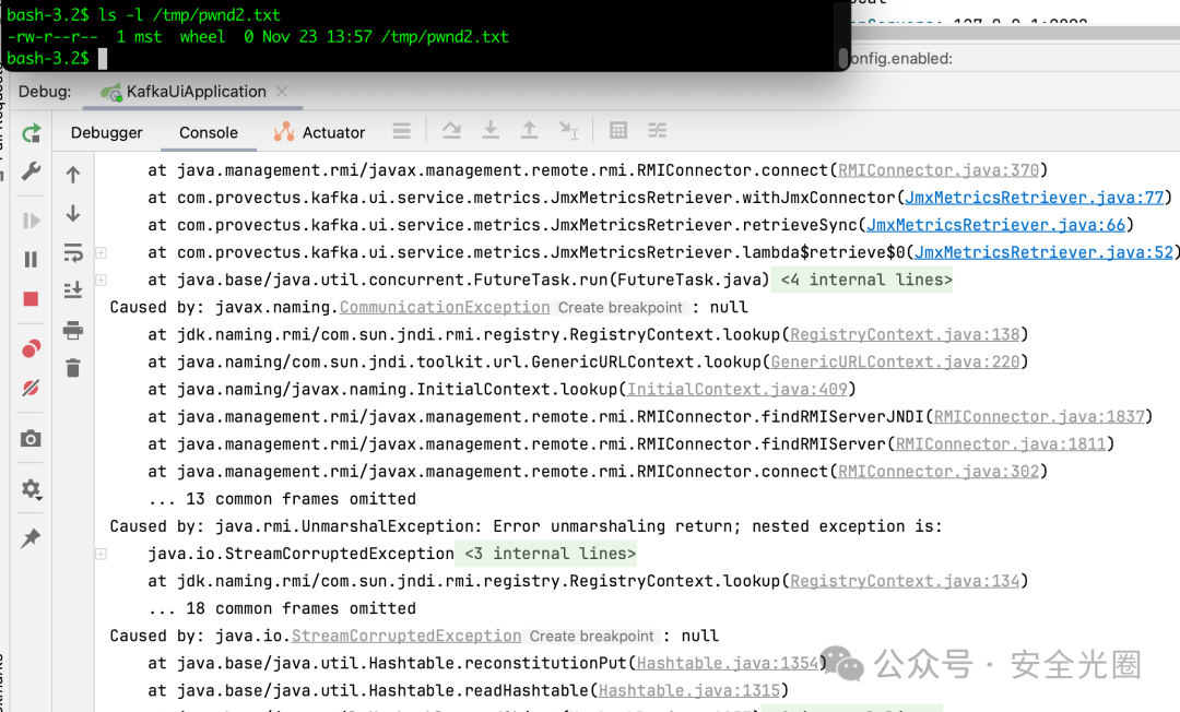 使用cc7链子,生成载荷,执行创建文件的命令。此时看日志,rmi报错,并且执行命令。