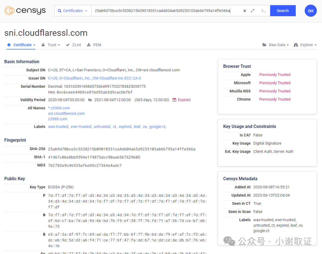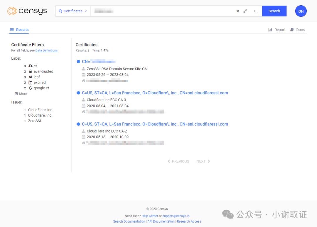 通过Censys引擎搜索证书信息,有些域名可以发现多个有效或无效的证书: