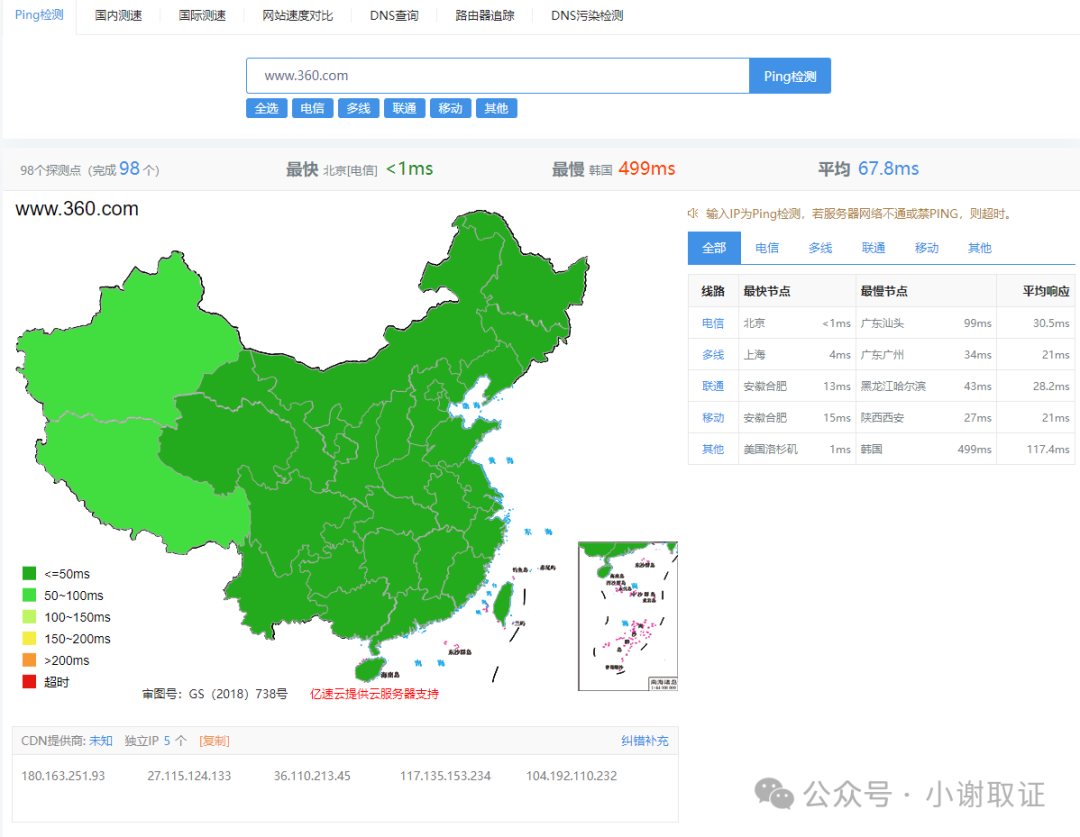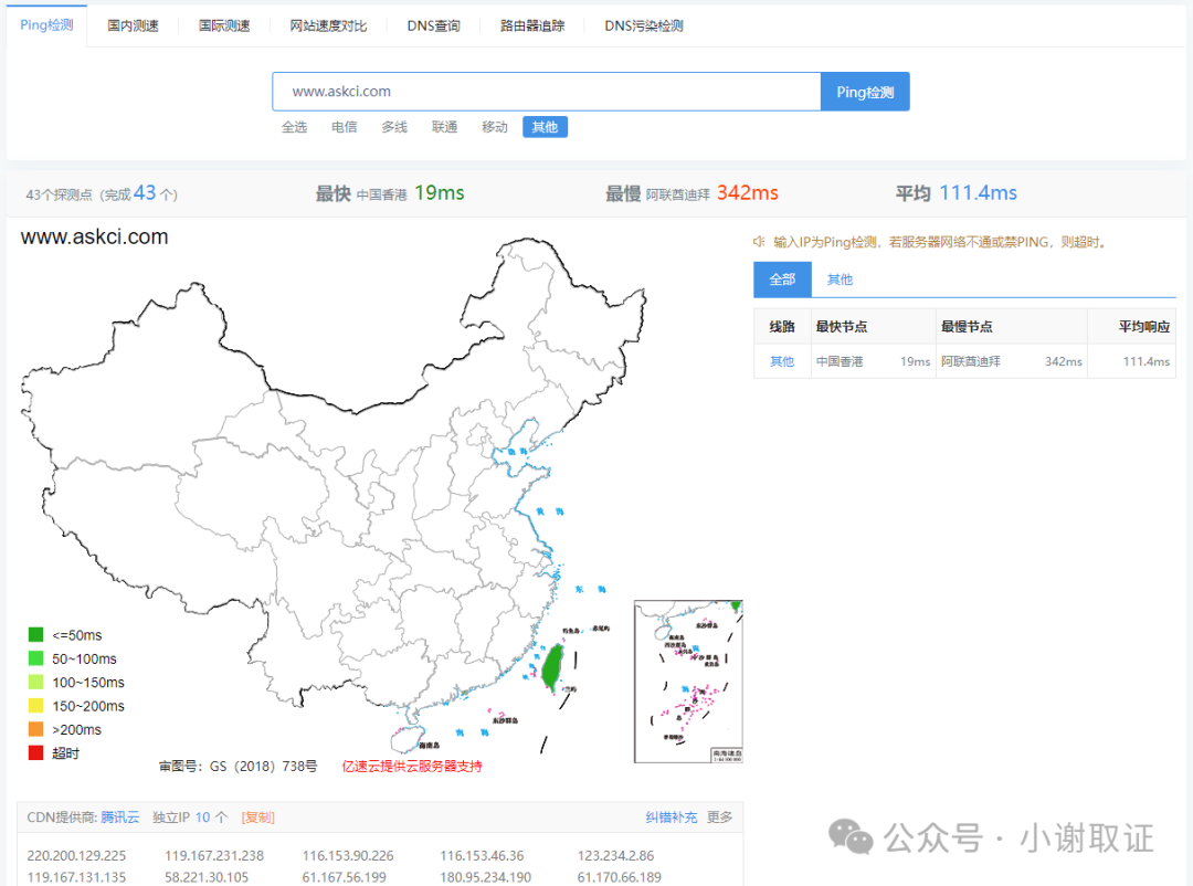 在进行前期侦办时,可以先ping域名,如果ping出来确定是使用CDN加速,并且获取到解析的IP。有了该IP在国内的情况下就可以联系这家CDN服务商调取域名解析的真实IP。知道了真实IP后就可以进行下一步的调证侦查等。如果使用的是国外的CDN服务商,或自架设型的CDN,大多情况下只能进行封堵。下面介绍怎么判断网站域名是否使用CDN技术。