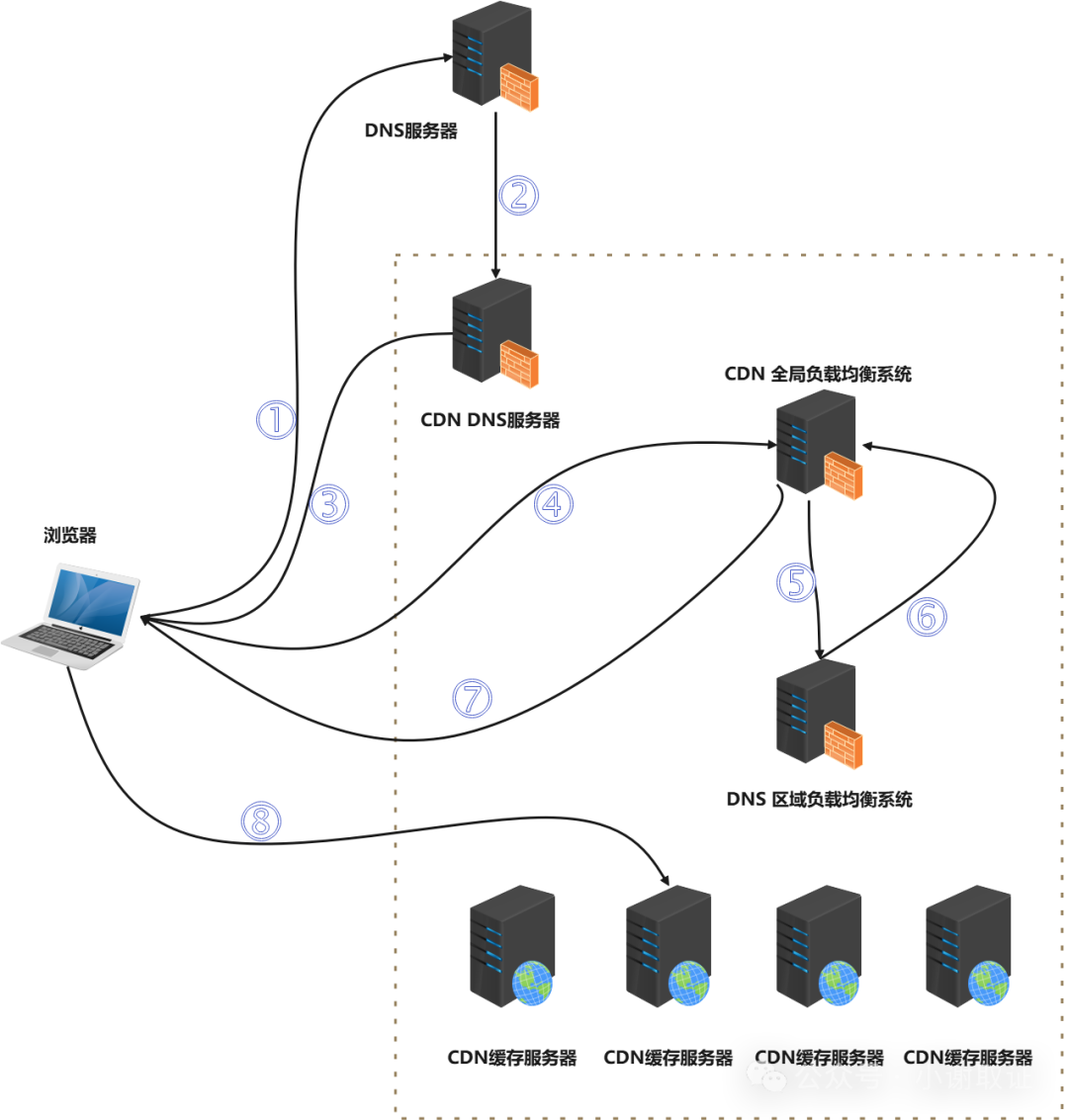 2)CDN 的 DNS 服务器将 CDN 的全局负载均衡设备 IP 地址返回给浏览器。