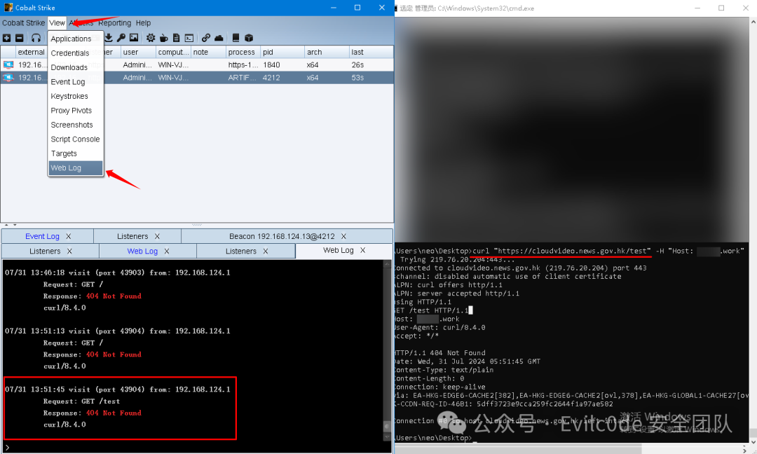打开CS的Web Log测试CDN是否能将流量转发成功,执行命令