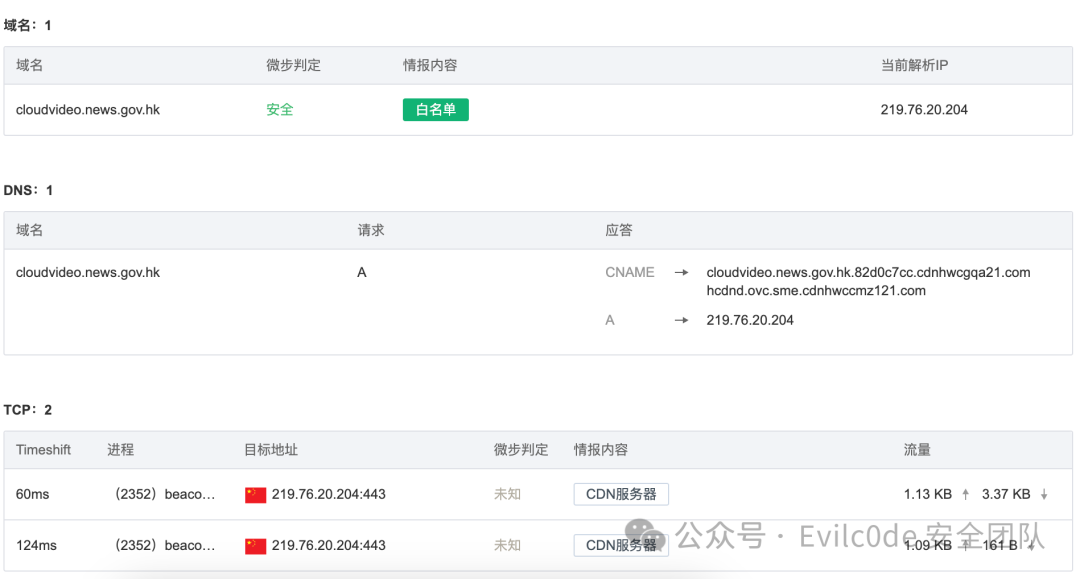 上传到微步沙箱查看通信域名是我们的可信域名,通信地址为华为云的CDN节点,完美隐藏我们的Host以及真实的C2服务器地址。