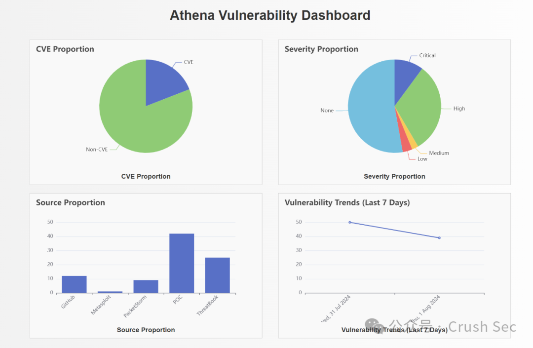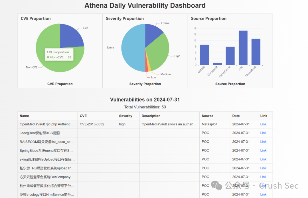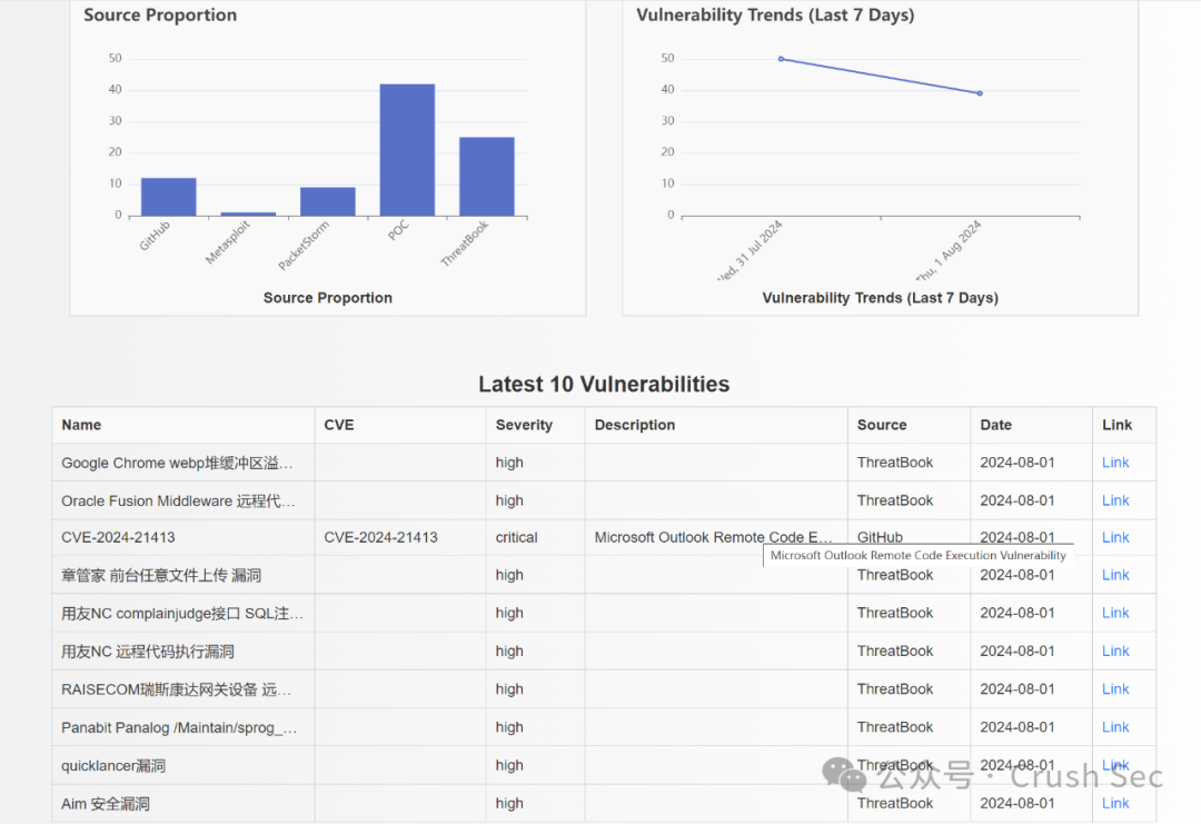 展示了当前日期CVE漏洞占比,各severity和source的漏洞占比,以及当天更新的所有漏洞信息。