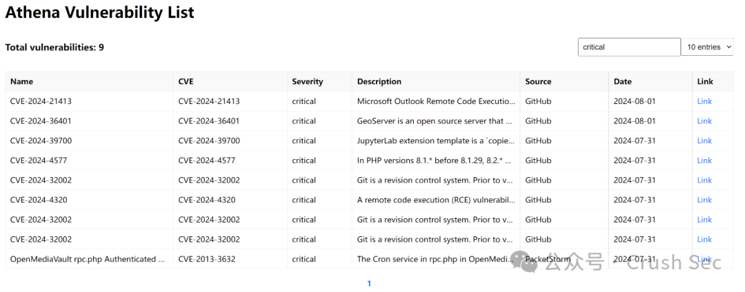 搜索框中为模糊搜索,支持全字段,例如搜索name,cve,source,severity,date等等: