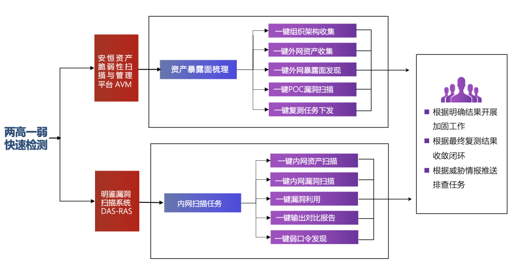 安恒信息“两高一弱”专项检测治理解决方案以全面的检测策略为核心,结合资产暴露面管理、漏洞自动验证,最终实现常态化安全运营目标。同时,我们还会根据最新的安全威胁和攻击手段,不断更新和优化安全防护策略,确保能够持续应对不断变化的安全挑战。