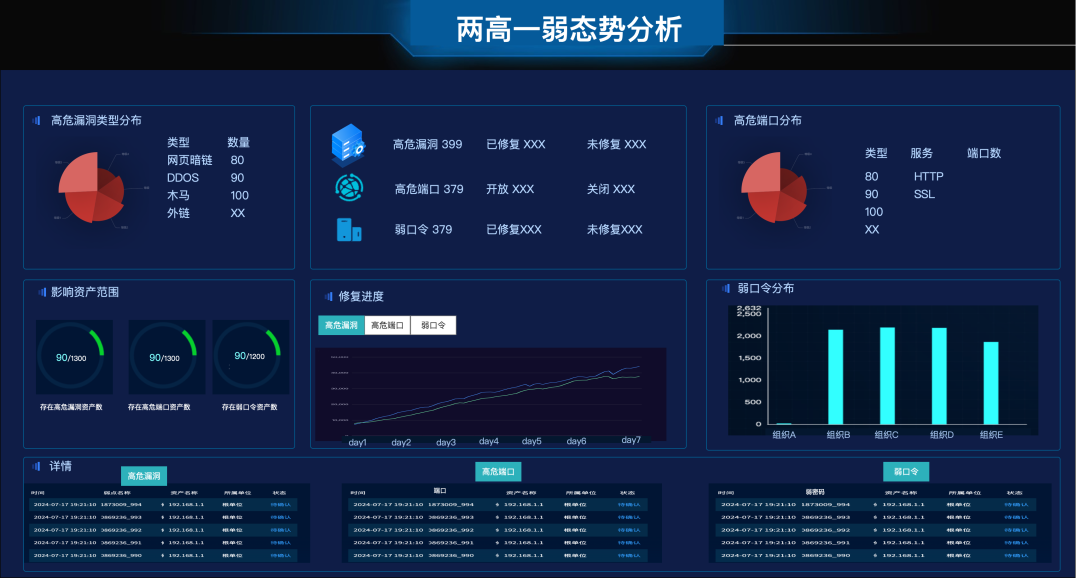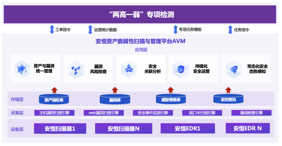 安恒信息以资产探测、安全漏洞监测为重点,以“检测、分析、预警、处置、情报、运营”全生命周期闭环管理为主线,形成安全漏洞信息统筹管理、资产漏洞安全风险排查、漏洞情报知识库共享、安全漏洞预警与闭环处置能力,打造上下贯通、两级联动的安全漏洞监测与管理体系,提升“两高一弱”专项行动中的资产漏洞治理水平。