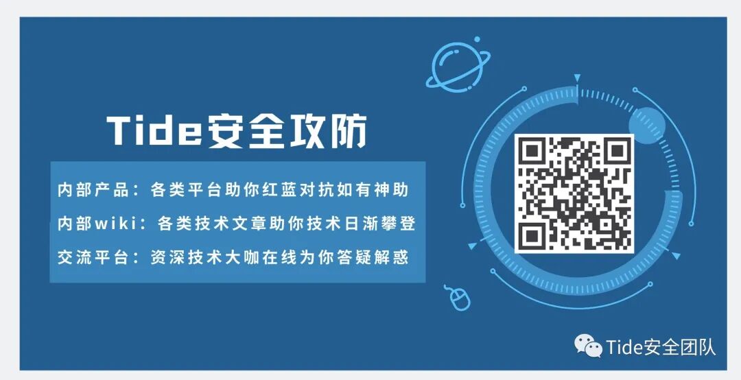 声明:Tide安全团队原创文章,转载请声明出处!文中所涉及的技术、思路和工具仅供以安全为目的的学习交流使用,任何人不得将其用于非法用途给予盈利等目的,否则后果自行承担!