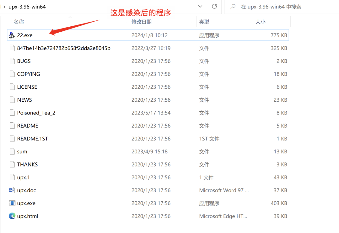 而我的upx文件夹在桌面下,这也可以说得通为什么放到upx文件夹中会被感染了。且病毒只能感染32位的exe程序,好像除了放到upx文件夹下的这几个文件被感染,其他的没啥(这病毒也一般般吧 /狗头)。