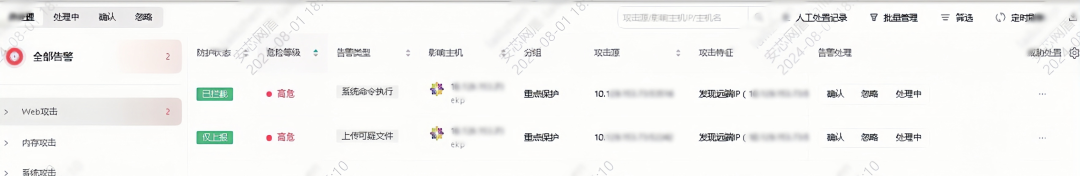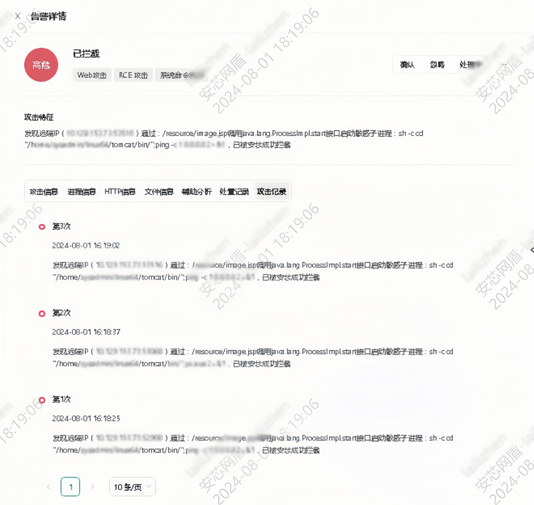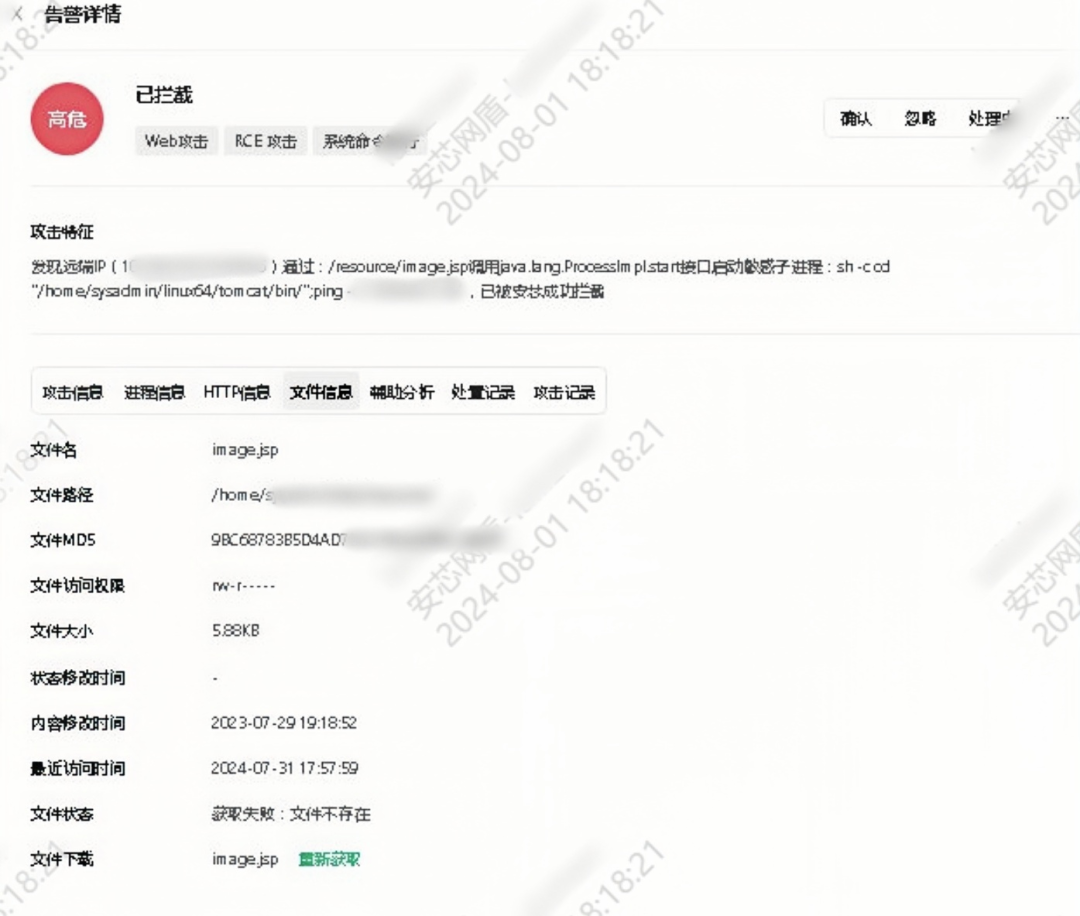 从告警详情中的文件信息来看,image.jsp文件创建于2023年7月29日,于2024年7月31日至8月1日被利用,潜伏时间长达1年。此次,攻击者通过该webshell执行内网嗅探的系统命令被安芯神甲实时发现并拦截。