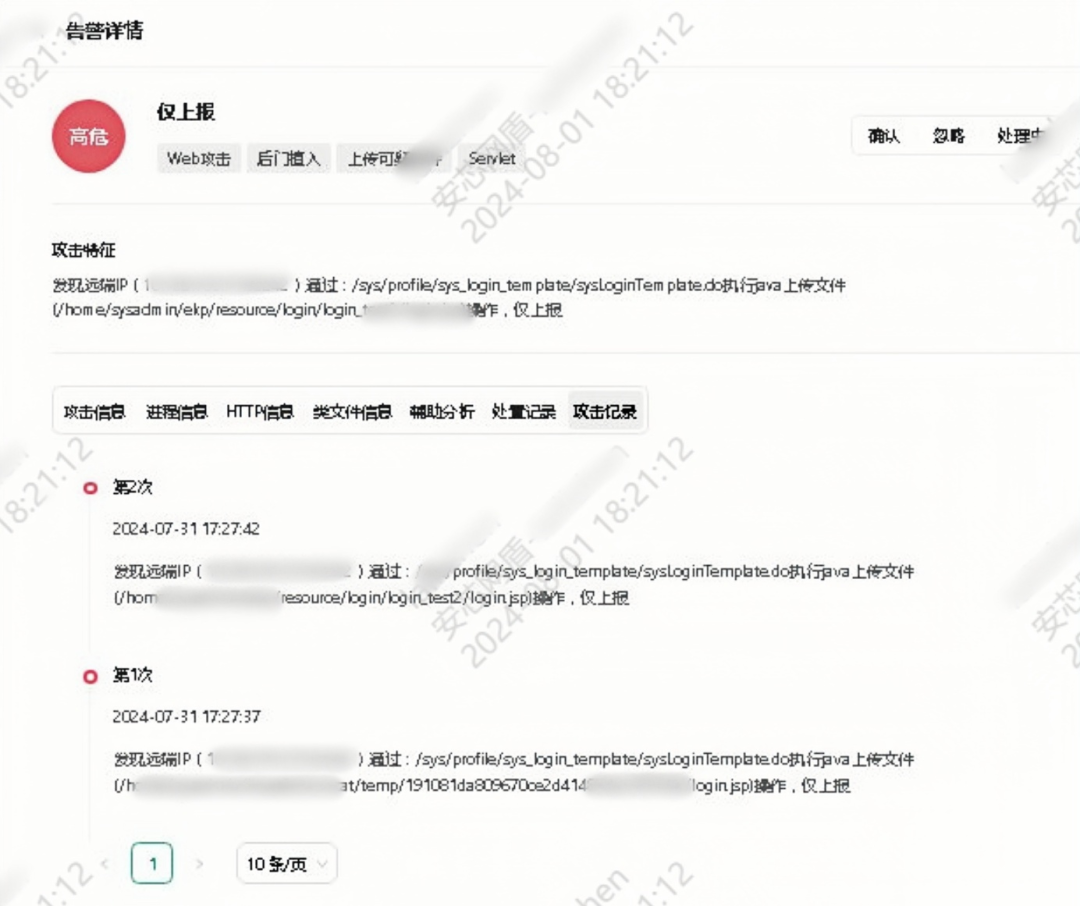 安芯神甲监测到一起上传可疑文件的Web攻击告警,被攻击的服务器为蓝凌软件的OA系统,攻击者利用远程IP通过SysLoginTemplate.do上传login.jsp文件,经安芯网盾技术人员与客户团队共同研判,确认为真实攻击。随后,客户开启了安芯神甲的拦截模式,以便在攻击者再次攻击时可实施阻断。